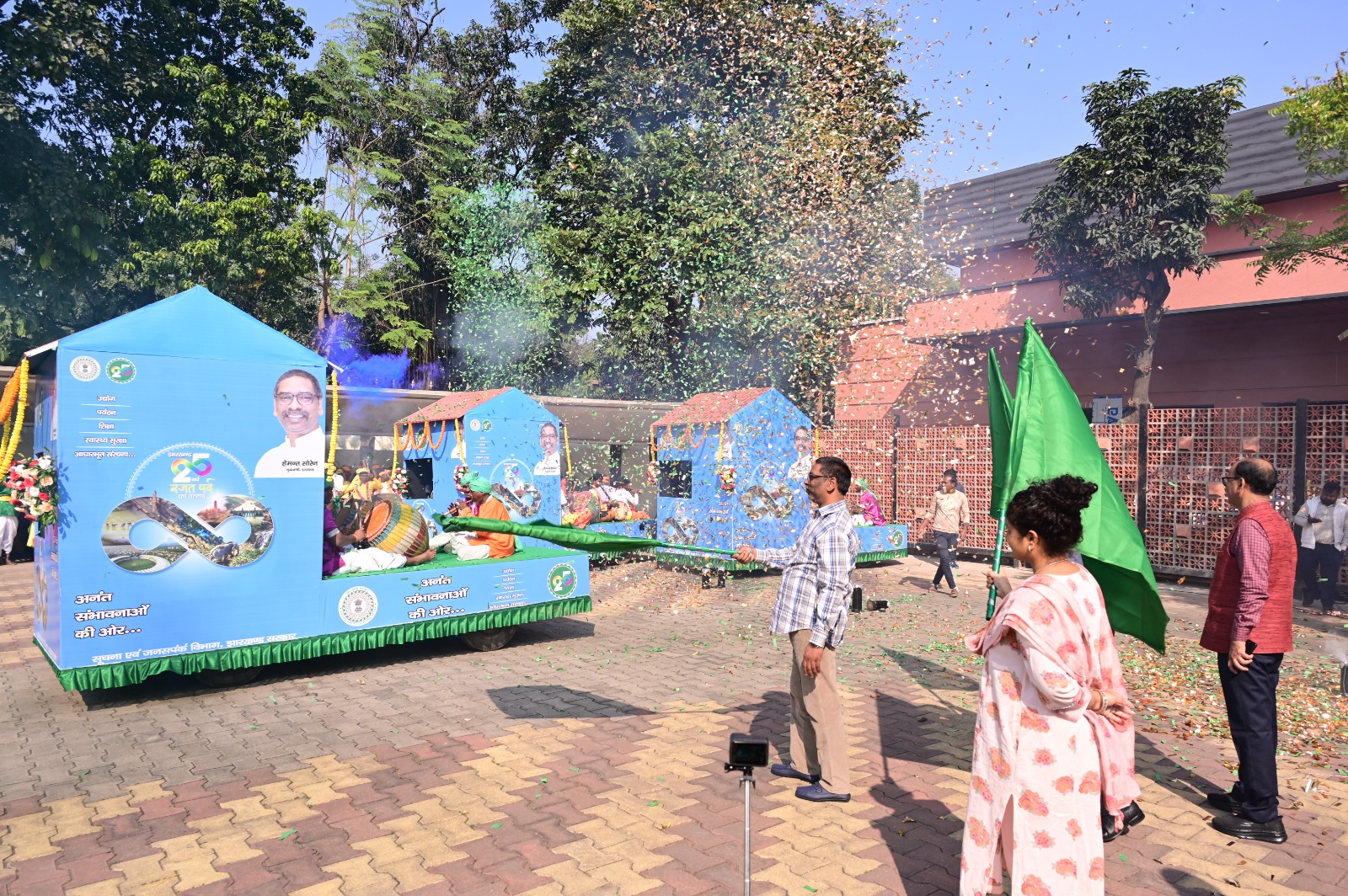 Ranchi:राज्य स्थापना के 25वें गौरवशाली वर्ष के उपलक्ष्य में मुख्यमंत्री आवासीय परिसर में आज सूचना एवं जनसंपर्क विभाग द्वारा जन-जागरूकता हेतु संचालित प्रचार वाहनों के “फ्लैग ऑफ़ कार्यक्रम” का आयोजन किया गया। मुख्यमंत्री हेमन्त सोरेन एवं विधायक कल्पना सोरेन ने प्रचार वाहनों को हरी झंडी दिखाकर रवाना किया। ये प्रचार वाहन राज्य के सभी जिलों, प्रखंडों एवं गाँवों में भ्रमण कर झारखंड की 25 वर्षों की उपलब्धियों, जनकल्याणकारी योजनाओं एवं विकास कार्यों की जानकारी जन-जन तक पहुँचाएंगे। इन वाहनों के माध्यम से युवाओं, महिलाओं, किसानों तथा समाज के सभी वर्गों को राज्य के समेकित विकास में भागीदारी हेतु प्रेरित किया जाएगा।