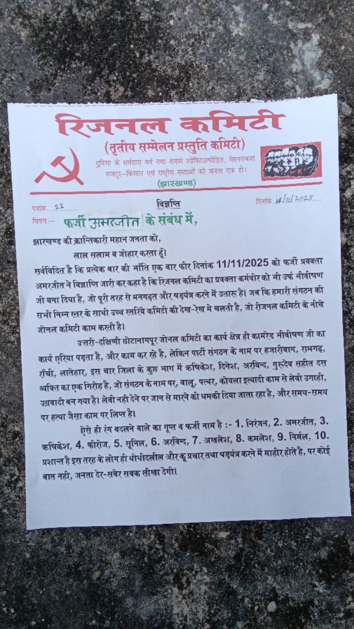 बुढ़मू:पिछले एक सप्ताह से क्षेत्र में सक्रिय उग्रवादी संगठन टीएसपीसी के बीच पर्चा वार से ठेकेदार,व्यवसायी वर्ग संशय में हैं इसके अलावे इस संगठन के नाम पर दो गुटों में खूनी संघर्ष की आशंका को भी बल मिल रहा है।शनिवार को संगठन के रीज़नल कमिटी के प्रवक्ता कर्मवीर जी के नाम पर विज्ञप्ति जारी कर सात नवंबर को अमरजीत जी के नाम पर जारी प्रेस विज्ञप्ति में जिन दस लोगों को क्षेत्र प्रभारी बताया गया था उसका खंडन किया गया है।