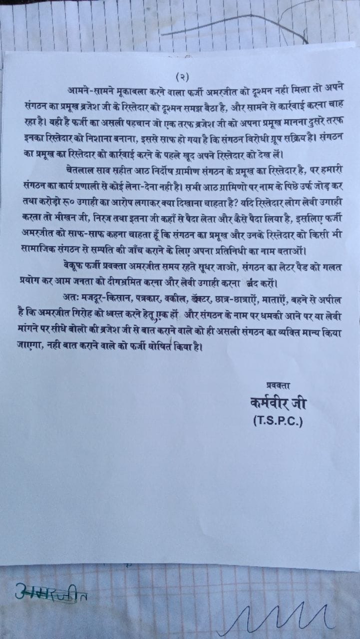 जारी विज्ञप्ति में अमरजीत समेत दस लोगों को फर्जी बताते हुए कहा गया है की जेल में बंद कुछ लोगों द्वारा चोर, गुंडा,बदमाशों का गिरोह बनाकर टीएसपीसी के नाम पर क्षेत्र में भयादोहन कर ट्रांसपोर्टरों,व्यवसायी,ठेकेदारों से लेवी वसूली किया जा रहा है जिनपर संगठन जल्द ही करवाई करेगी।